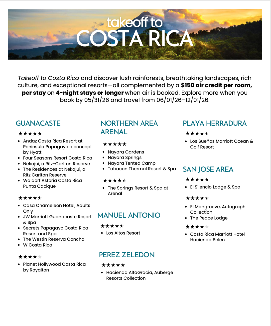 Takeoff to Costa Rica and discover a destination where lush rainforests, breathtaking landscapes, rich culture, and exceptional resorts create the perfect setting for an unforgettable escape. From relaxing beachfront retreats to nature-filled getaways and adventure-driven stays, Costa Rica offers something for every travel style.