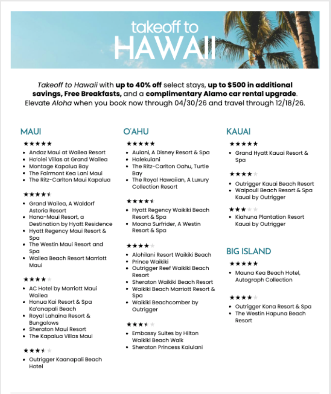 From Maui’s sun-drenched shores and Oahu’s iconic coastline to the dramatic beauty of Kauai and the natural wonders of the Big Island, experience Hawaii with exceptional value. Enjoy up to 40% savings, Free Breakfasts, and up to $500 in added value on select luxury resort stays, along with thoughtful resort inclusions and a complimentary Alamo car rental upgrade to explore each island in comfort. These limited-time offers are designed for travelers who seek elevated experiences, effortless travel, and unforgettable island escapes.